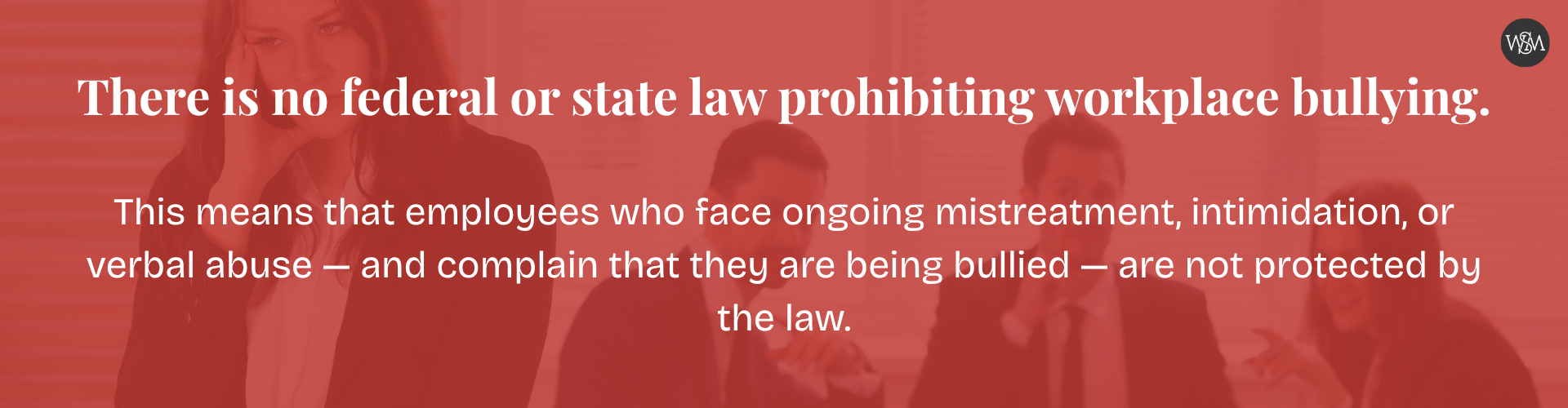 Unlike schools, where anti-bullying policies are often clearly outlined and enforced, the workplace lacks specific protections against bullying behavior. There is no federal or state law prohibiting workplace bullying. This means that employees who face ongoing mistreatment, intimidation, or verbal abuse and complain that they are being bullied are not protected by the law.