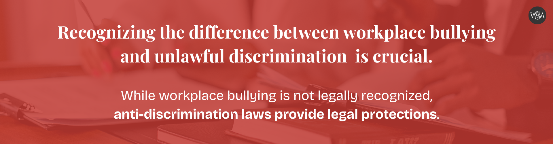 These forms of harassment are illegal under federal laws like Title VII of the Civil Rights Act, the Americans with Disabilities Act, and the Age Discrimination in Employment Act, among others. In such cases, you have the right to report the behavior to HR or a supervisor, and your employer is legally obligated to take appropriate action to address the discrimination. Recognizing the difference is crucial: while workplace bullying is not legally recognized, anti-discrimination laws provide legal protections.